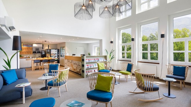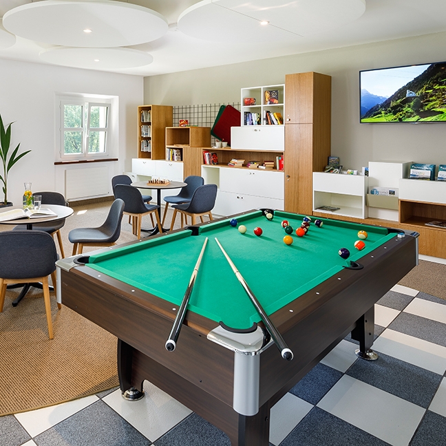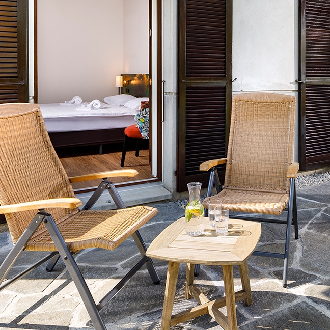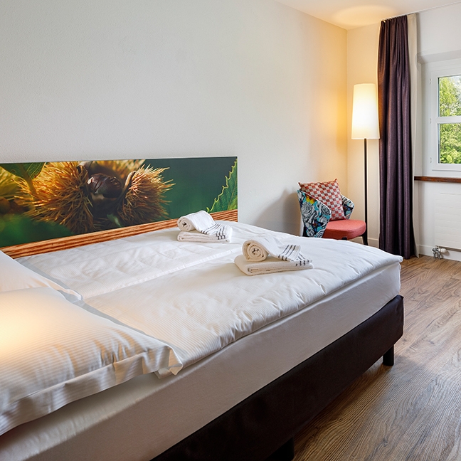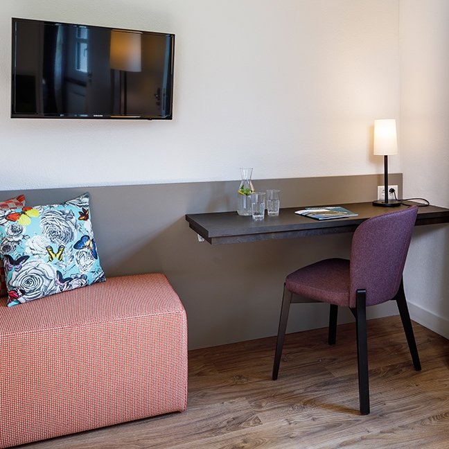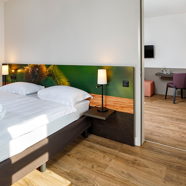 Ein schlanker Glastisch steht vor dem Sofa, auf dem eine schlichte Vase mit frischen Blumen steht. Entlang einer Wand erstreckt sich ein maßgeschneiderter Einbauschrank, der diskret Stauraum bietet. Insgesamt strahlt das Zimmer eine moderne und gehobene Atmosphäre aus.